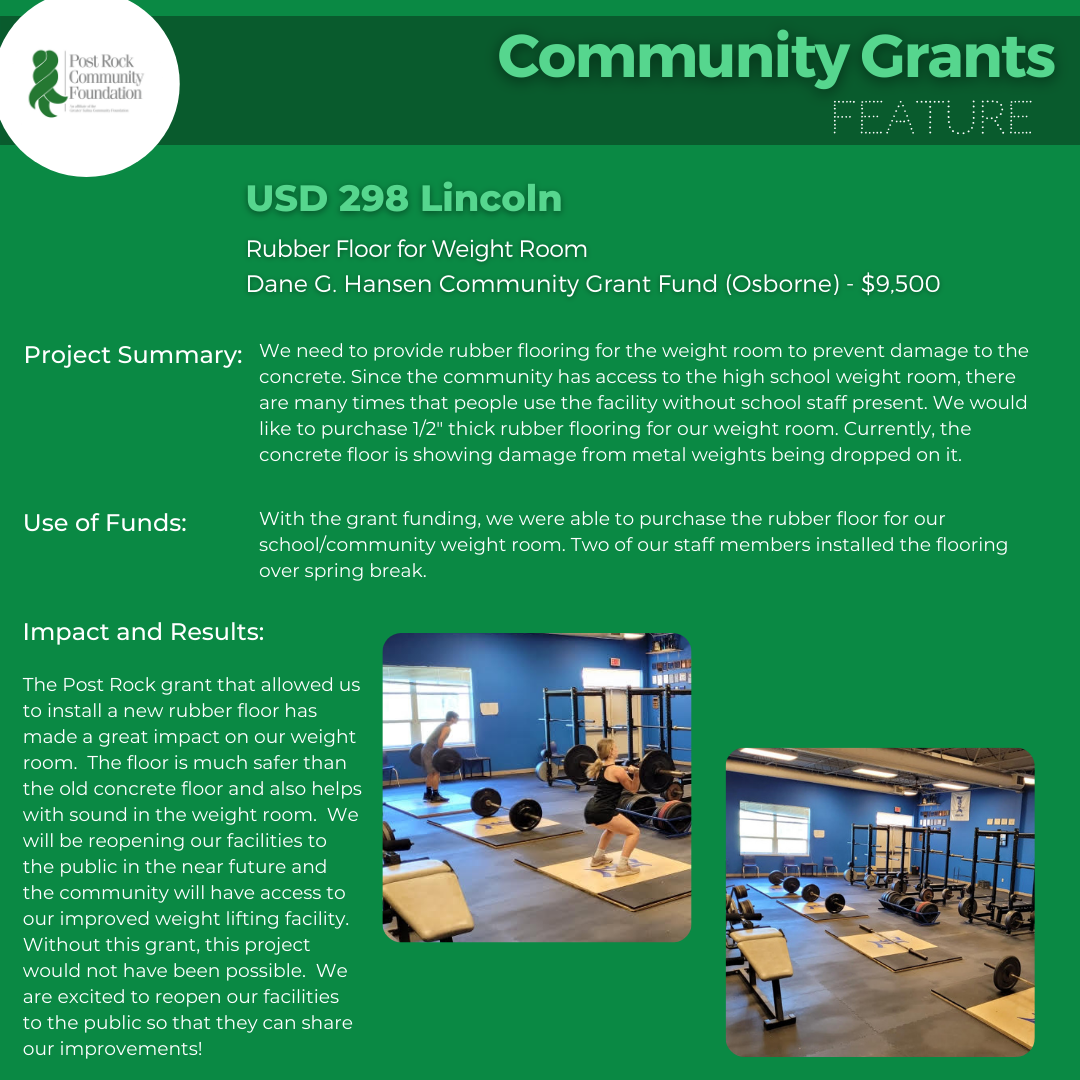 The grant funding from the community foundation allowed USD 298 Lincoln to provide rubber flooring for the weight room to prevent damage to the current concrete floor. "Without this grant, this project would not have been possible. We are excited...